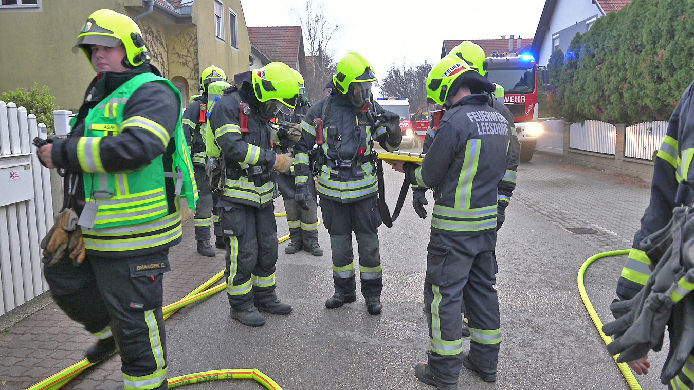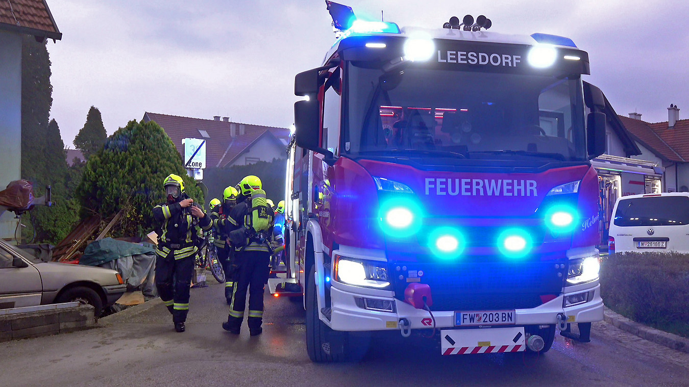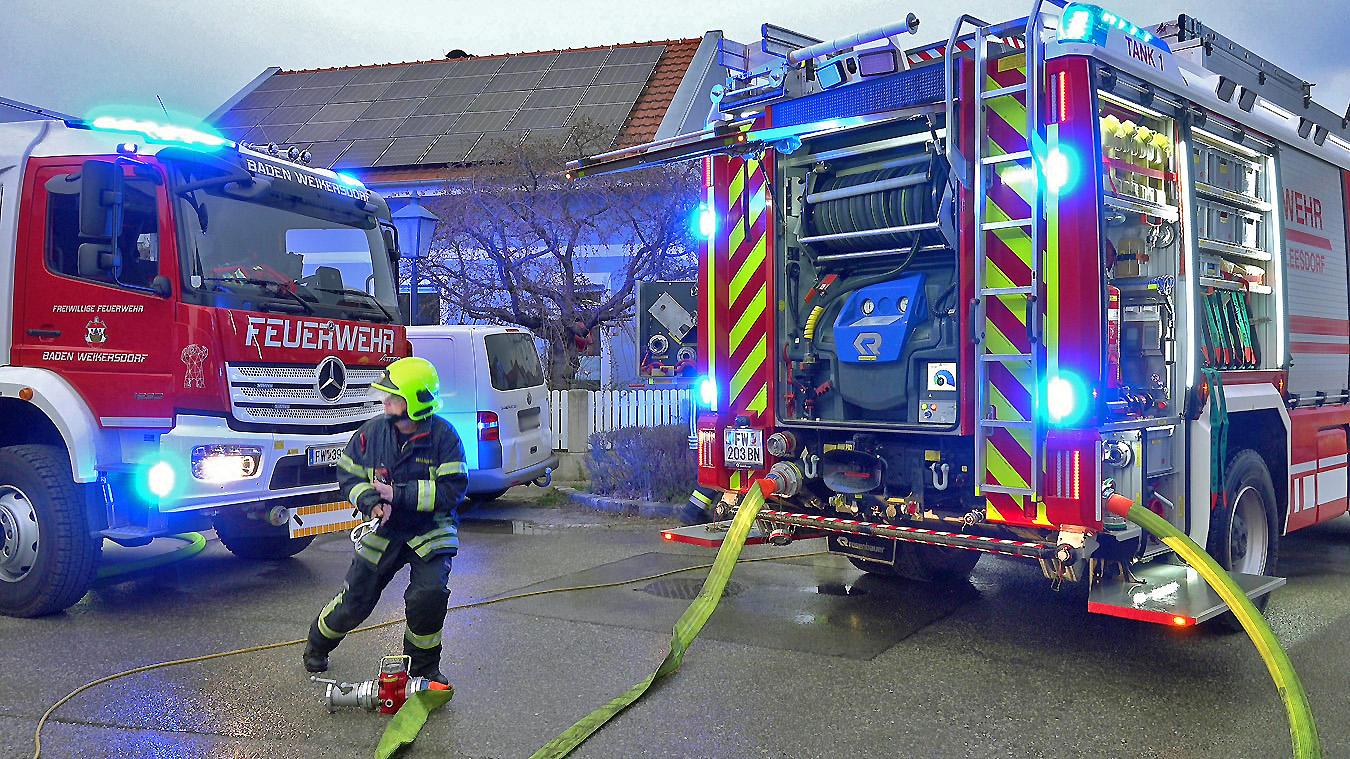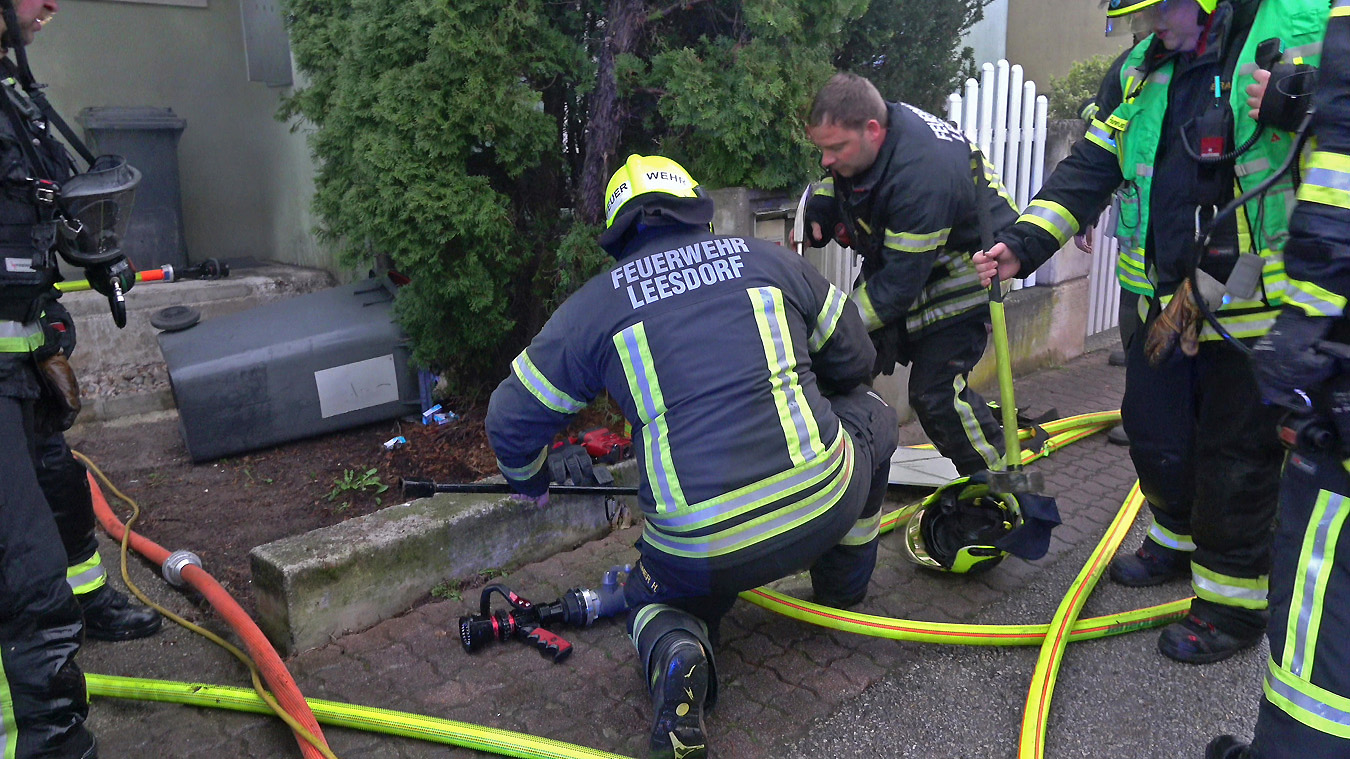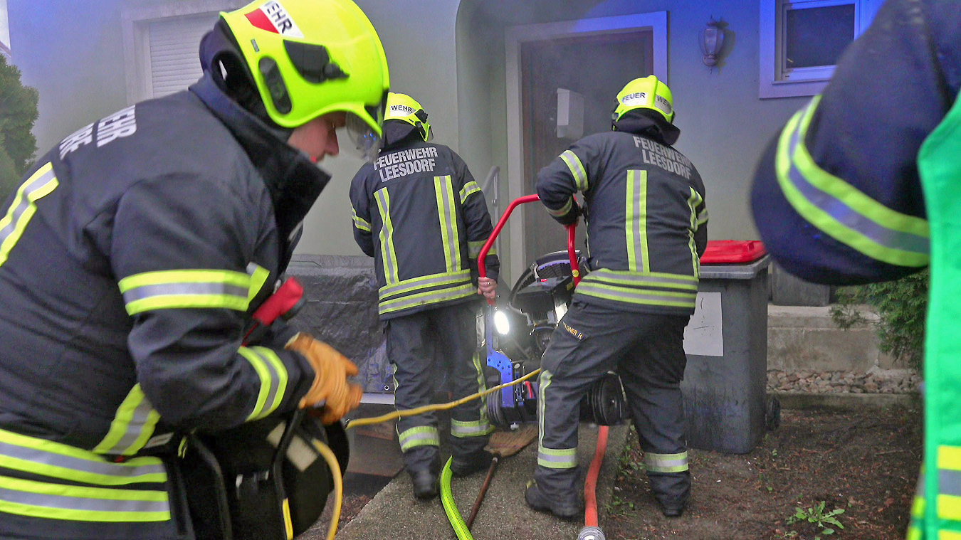 Bei Eintreffen der alarmierten Einsatzkräfte befanden sich alle Hausbewohner im Freien und informierten den Feuerwehreinsatzleiter Kommandant Stellvertreter Andreas Walter (FF Baden-Leesdorf), dass es im Keller bei der Gasheizung brennt. Zu dem Zeitpunkt war über die offene Eingangstüre bereits eine starke Verrauchung auch im Erdgeschoß des Reihenhauses wahrnehmbar.