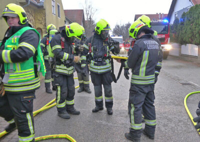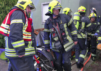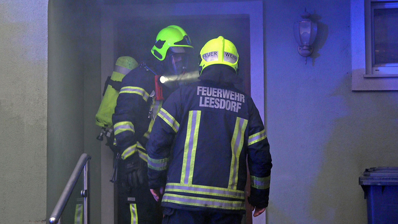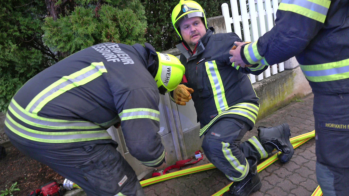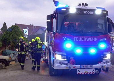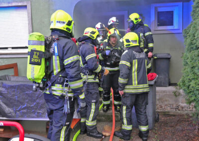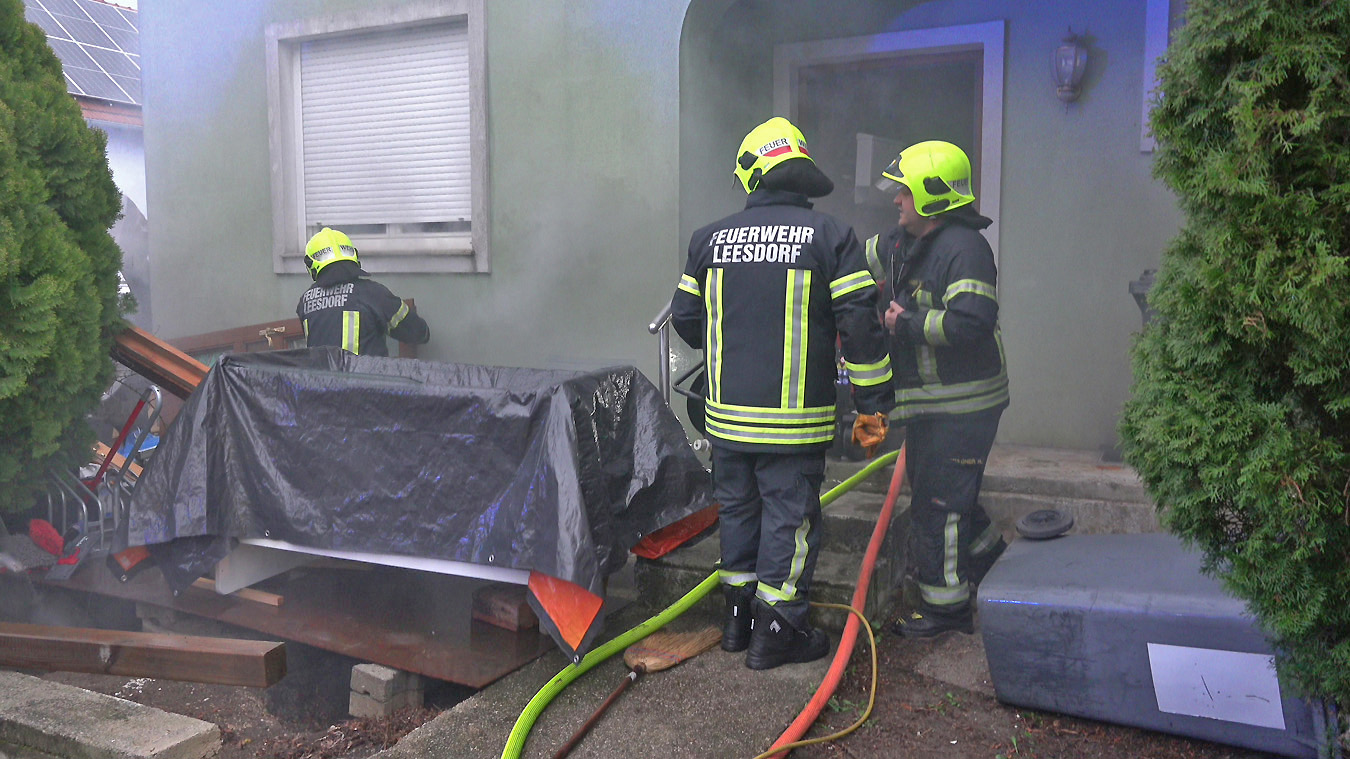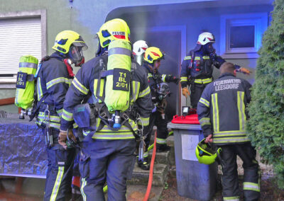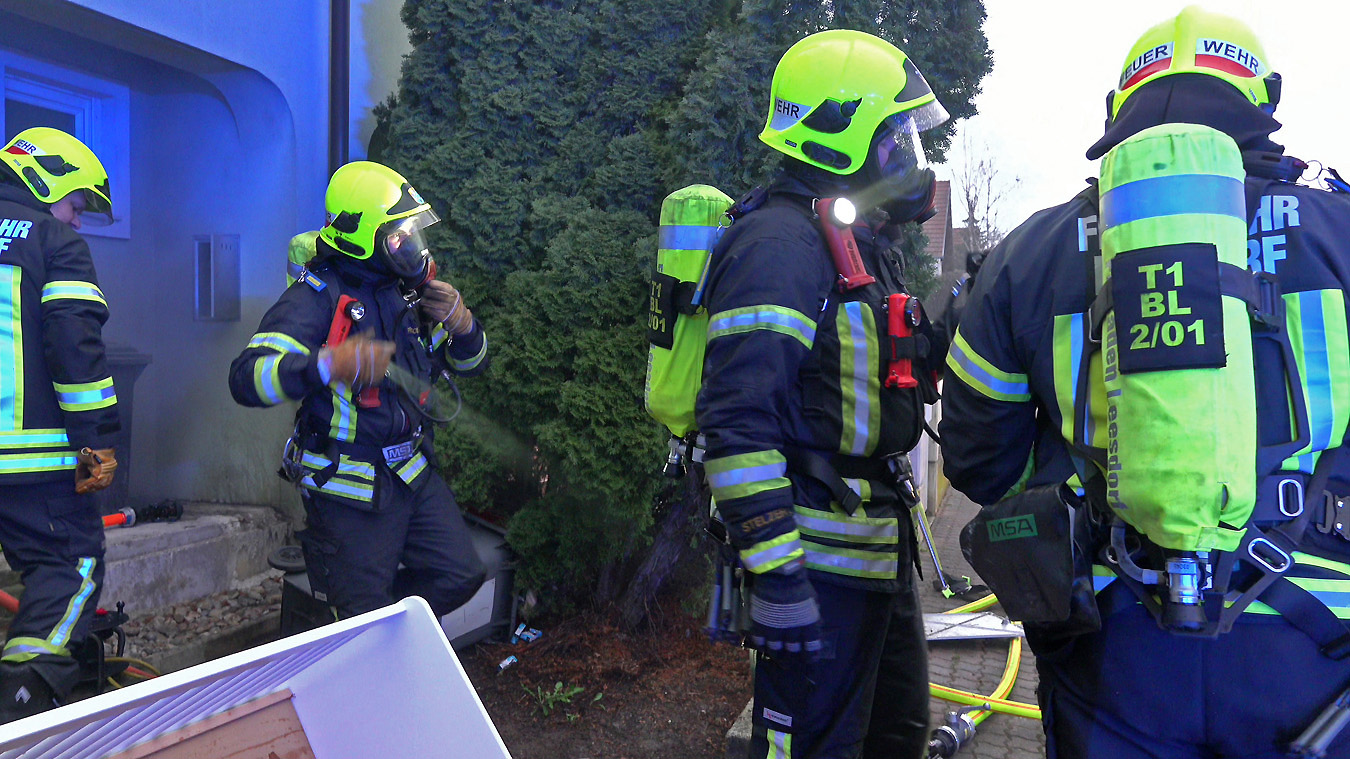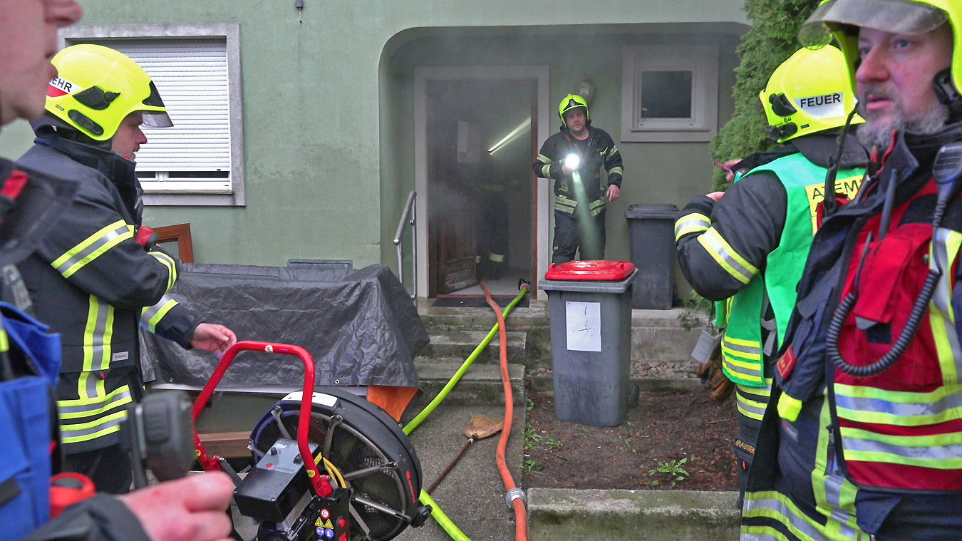 Bei Eintreffen der alarmierten Einsatzkräfte befanden sich alle Hausbewohner im Freien und informierten den Feuerwehreinsatzleiter Kommandant Stellvertreter Andreas Walter (FF Baden-Leesdorf), dass es im Keller bei der Gasheizung brennt. Zu dem Zeitpunkt war über die offene Eingangstüre bereits eine starke Verrauchung auch im Erdgeschoß des Reihenhauses wahrnehmbar.