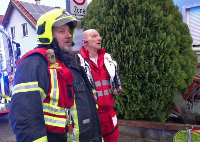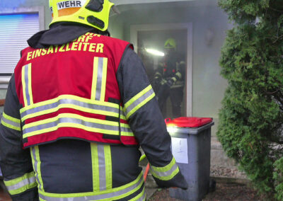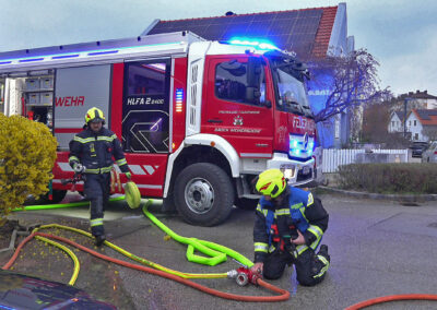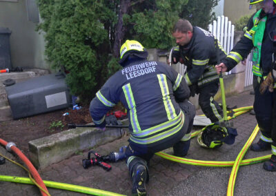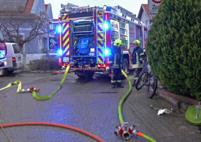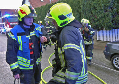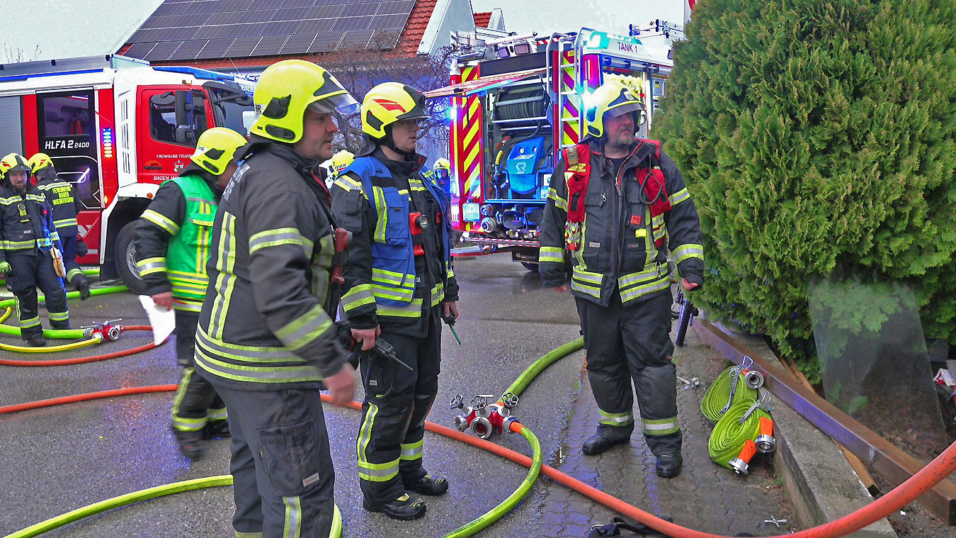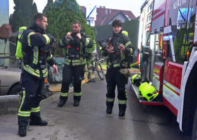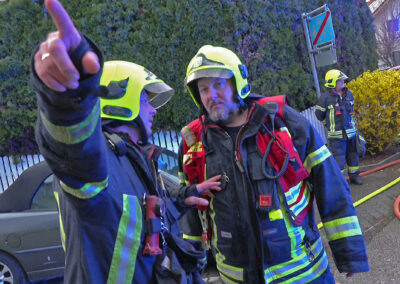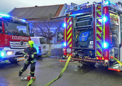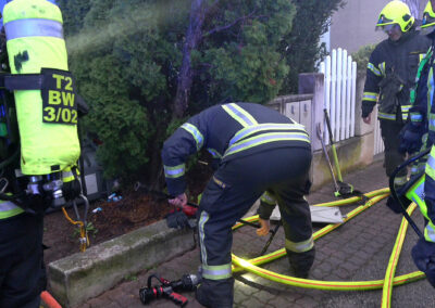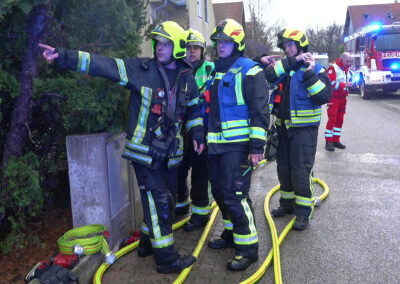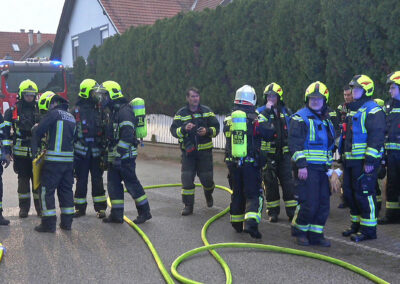 Daher zogen sich die zwei Atemschutztrupps zurück und teilten dies der Einsatzleitung mit. Umgehend ließ man den Strom im Bereich des E-Hausanschlusskasten abschalten und sperrte die Wasserzufuhr über den Absperrschieber im Straßenverlauf.