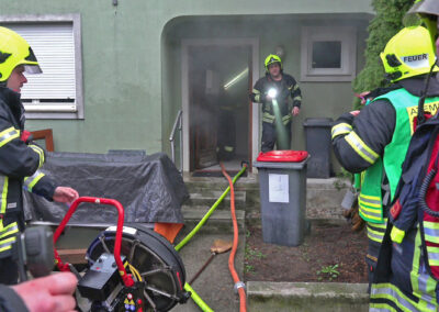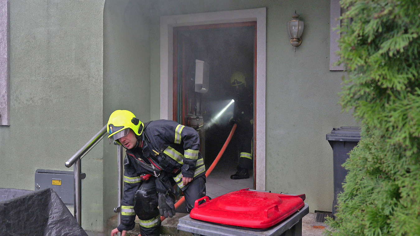 Umgehend wurden zwei Löschleitungen aufgebaut und als Erstmaßnahme die Gaszufuhr über den Hauptabsperrhahn im Freien geschlossen. Die weitere Erkundung der zwei vorgehenden Atemschutztrupps mit gefüllter Löschleitung ergab, dass der Brand fast zur Gänze erloschen war aber aus der beschädigten Kunststoff-Hauptwasserrohrleitung massiv Wasser ausläuft. Wobei das ausgelaufene Wasser auch in alle anderen Räumlichkeiten im Keller eindringen konnte. Zusätzlich waren einige Stromleitungen durch den Brand beschädigt.