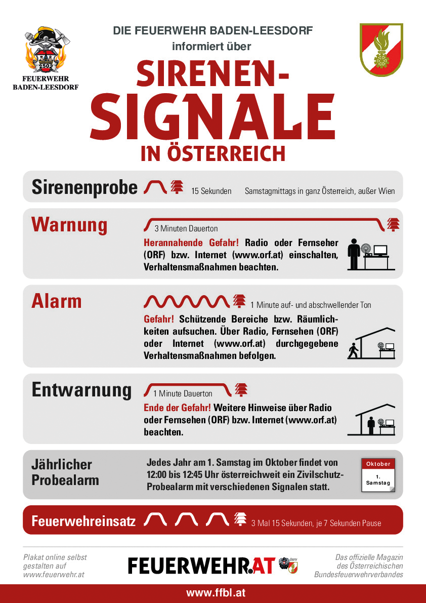 Feuerwehralarm: 3 x 15 Sekunden dazwischen 7 Sekunden Pause. In der Stadtgemeinde Baden werden die Feuerwehrmitglieder „still“ alarmiert, es erfolgt keine Auslösung der Sirenen zur Alarmierung eines Feuerwehreinsatzes.